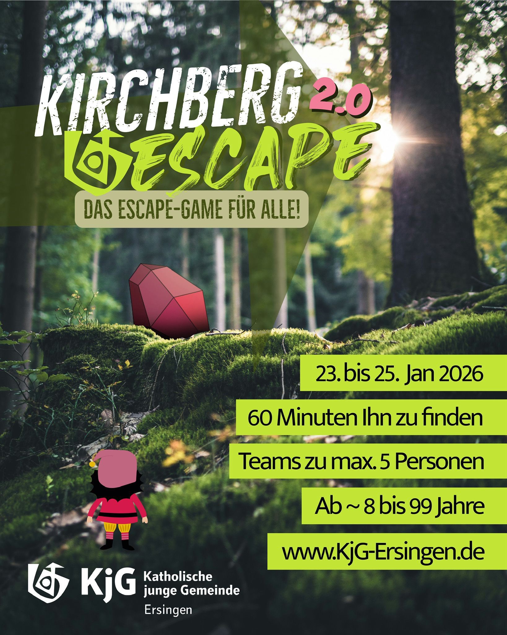 Weitere Informationen, wie auch die verschiedenen Termine von je 60 Minuten am Wochenende vom 23. bis 25. Januar 2026, findet ihr unter www.KjG-Ersingen.de .